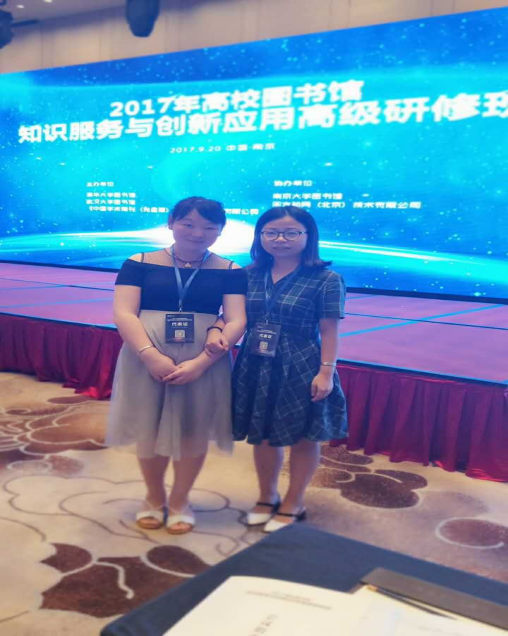 本网讯(图书馆 李幸)9月20日-22日,2017年高校图书馆知识服务与创新应用高级研修班在南京举办,此次活动由清华大学图书馆、武汉大学图书馆和《中国学术期刊(光盘版)》电子杂志社有限公司联合主办,南京大学图书馆、同方知网(北京)技术有限公司协办。我校图书馆李丹、李幸两位老师参加了研修班学习。