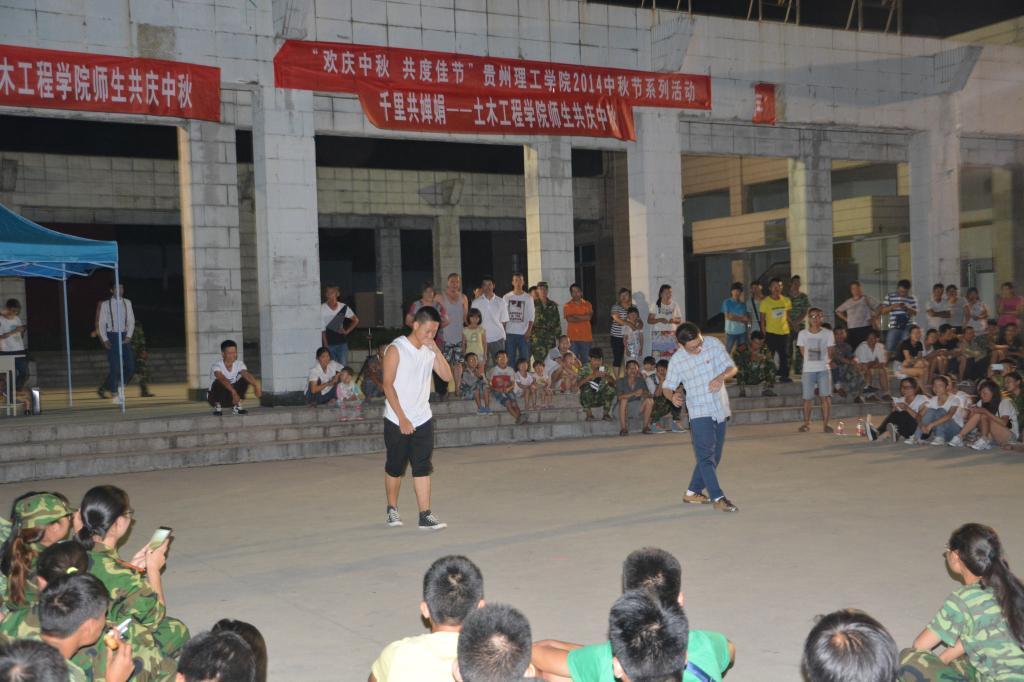 傍晚时分,平日安静的逸夫广场上人声鼎沸,热闹非凡。土木学院新老师生欢聚一堂,共话中秋。晚会开始前,每位新生都收到了学长学姐亲手送上的月饼,心里暖意无限,而开场的接歌环节更引爆了大家的热情。学长载歌载舞,新生多才多艺,B—BOX表演让场上同学拍手叫好,一首深情的吉他伴唱《月亮代表我的心》令观众如痴如醉;帅气的双截棍和咏春拳表演不时赢得阵阵欢呼。除表演外,师生共同参与的抢板凳游戏更是将现场气氛推向高潮。精彩的表演引得其它学院学生和周边居民纷纷驻足观看。
